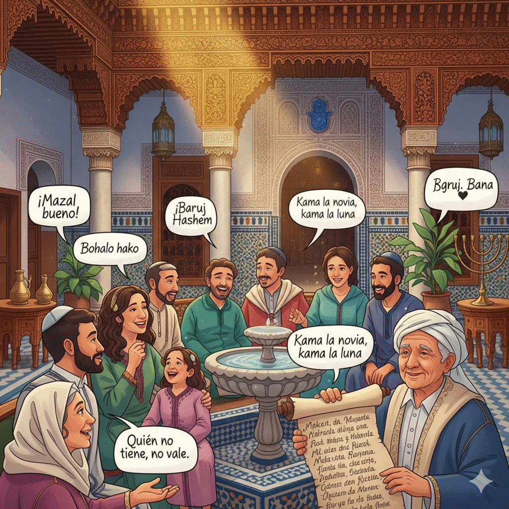 una mano – significa el número cinco. Por superstición el «cinco» se reemplaza con «mano» Ya ḥasrá por esos días luzzidos – expresión que lamenta la pérdida de los mejores tiempos; quien no los diera.